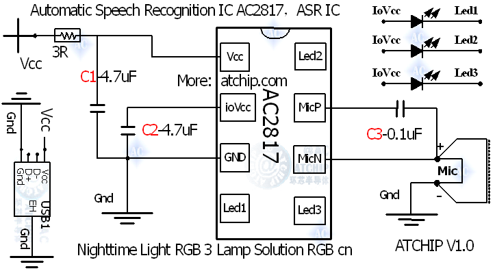 離線語音識別芯片-七彩小夜燈AC2817中文版方案原理圖: