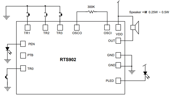 | RTS902 is a CMOS LSI designed for toys, doorbells and music boxes. It plays prprogrammed