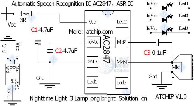 小夜燈語音識別芯片-AC2847英文版方案IC 開關燈語音識別芯片 / AC2847en |