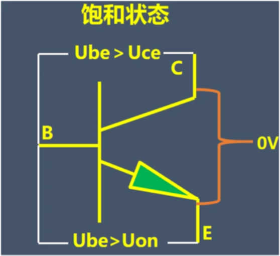 三極管當(dāng)作開關(guān)時其工作在飽和狀態(tài),BE間的電壓要大于開啟電壓,同時BE間的電壓大于CE間的電壓,CE間的電壓可以近似的看成是0。