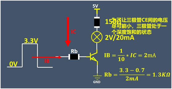 為了讓三極管CE間的電壓盡可能小,三極管處于一個深度飽和的狀態(tài),一般三極管基極的電流取集電極電流的十分之一,這里也就是2mA,三極管導(dǎo)通電壓取0.7V,所以有Rb為1.3K歐姆。