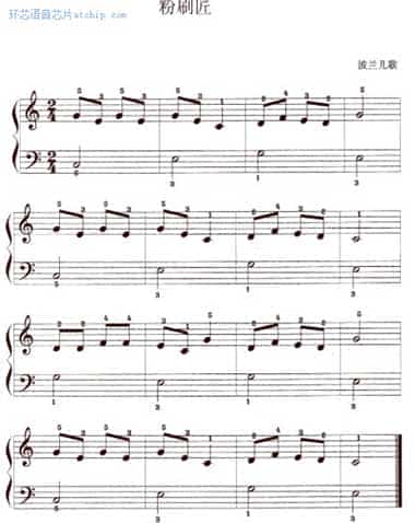 粉刷匠是人教版小學(xué)音樂(lè)一年級(jí)第二冊(cè)第九課的一首演唱曲,一方面生動(dòng)地描繪了小粉刷匠在欣賞自己的勞動(dòng)成果,得意炫耀自己勞ATChip.com動(dòng)技術(shù)的同時(shí),表現(xiàn)了小粉刷匠一心只顧勞動(dòng),弄得鼻子也刷了白灰的頑皮神態(tài),一方面教育學(xué)生熱愛(ài)勞動(dòng)傳播了樂(lè)觀向上的精神。