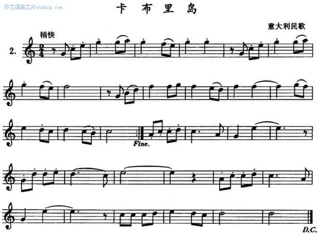 卡布里島屬于典型的地中海氣候的海島,這首歌頌卡布里島的民歌具有很強(qiáng)的浪漫ATChip.com氣息,表達(dá)了對它無限的熱愛與憧憬。民歌曲調(diào)華麗,富于裝飾,節(jié)奏有嚴(yán)格的和自由的兩性。