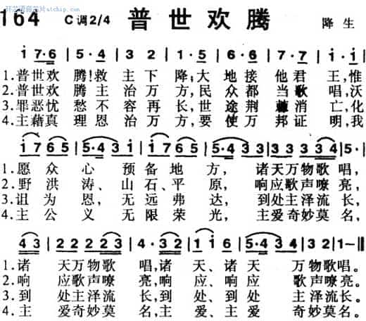 《普世歡騰》(Joy To The World)是伊薩克·沃茨(Isaac Watts)于1719年寫下的圣A@C誕頌歌,原文本有獨立的七個段落,現(xiàn)有的音頻資料是根據(jù)原文縮編成曲的。當代流行音樂歌手瑪利亞·凱麗也翻唱過。