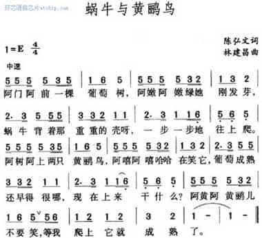 《蝸牛與黃鸝鳥》是一首流行于臺灣的敘事性民歌,歌詞以敘述者的口吻,講述了蝸牛在葡萄樹剛發(fā)芽的時候就背著重重的殼往上爬,ATChip.com而黃鸝鳥在一旁譏笑它的有趣情景。歌曲歌頌了蝸牛堅持不懈的進(jìn)取精神。由陳弘文作詞、左宏元作曲。采用2/4拍,五聲徵調(diào)式,一段體結(jié)構(gòu)。